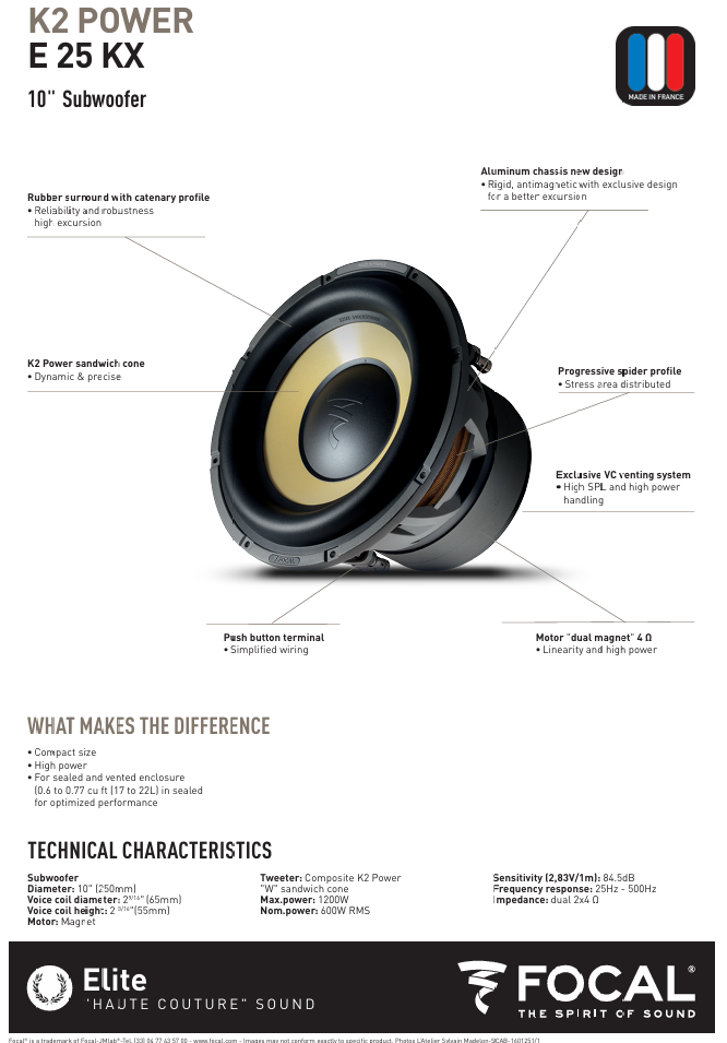 At the top end of the sub, a butyl rubber surround maintains control of the cone, even during deep excursion. Focal's unique composite sandwich cone employs a structural foam central core coated with a layer of Aramid fiber on the front and a glass layer on the back side. The three layers together form an incredibly rigid yet lightweight membrane for high-quality sound reproduction with an added emphasis on thunderous sound pressure.