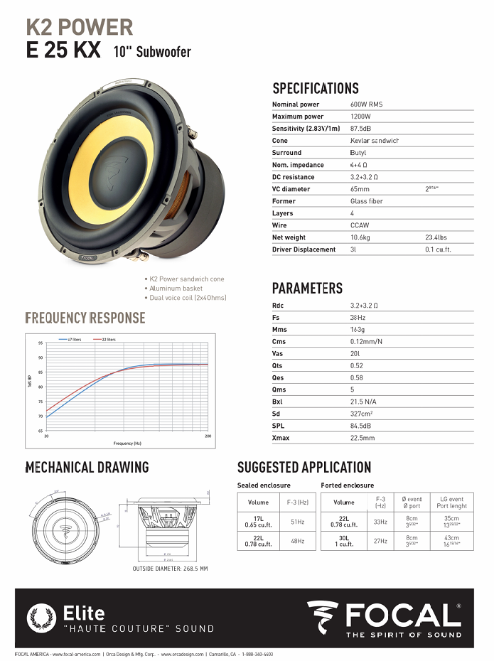 You can feed the K2 Power E 25 KX 10" subwoofer up to 600 watts RMS without fear. This dual 4-ohm voice coil sub works best in sealed enclosures to produce bass that's highly accurate and plenty forceful. Focal assembles each sub by hand and rigorously inspects them for any flaws to ensure your investment performs to the high sonic standards they've set.