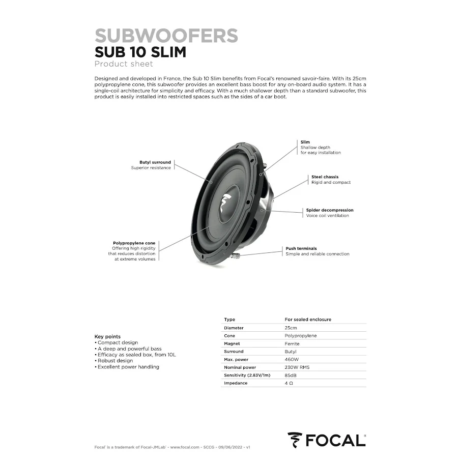 Designed and developed in France, the Sub 10 Slim benefits from Focal’s sound savoir-faire. With its 10” (25 cm) polypropylene cone, this subwoofer provides an excellent bass boost for any on-board audio system. It has a single voice coil architecture for simplicity and efficacy. With a very shallow depth, this product is easily installed into restricted spaces such as the sides of a car boot.