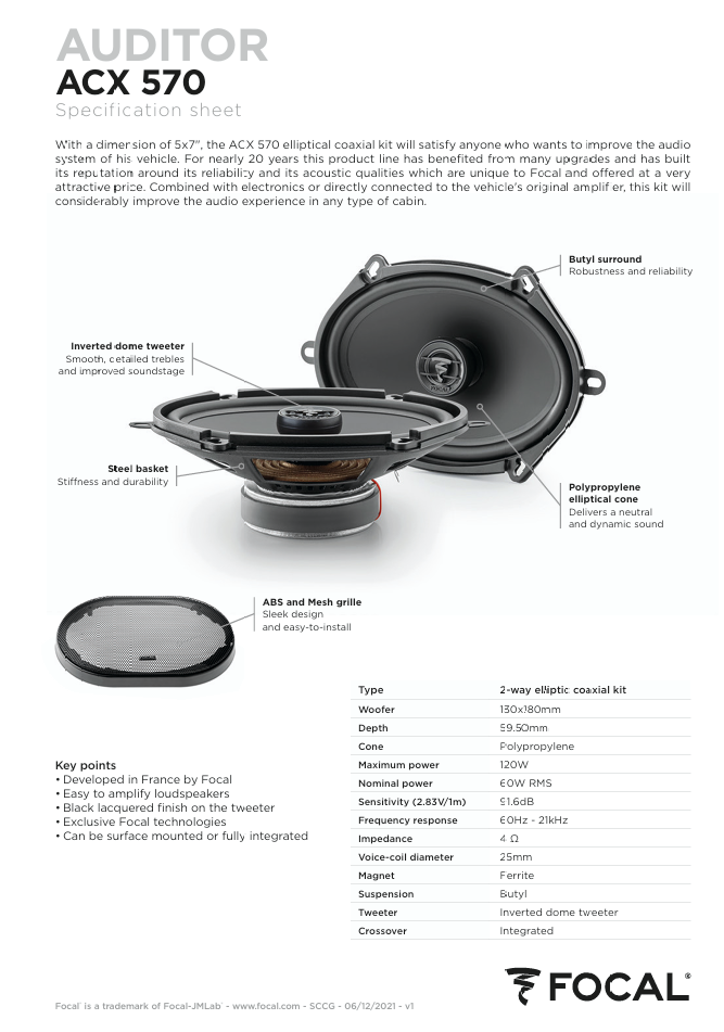 Like all the Auditor kits, the 2-way coaxial elliptical kit ACX 570 delivers neutral and dynamic sound, precise treble and an improved soundstage thanks to its woofer with polypropylene cone and its adjustable, inverted dome mylar tweeter.