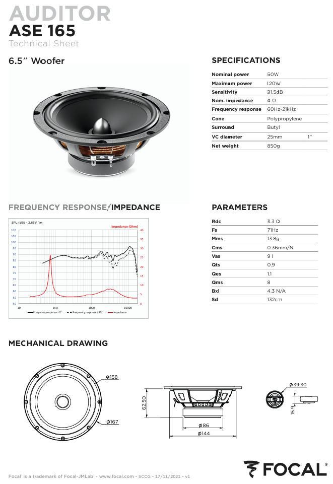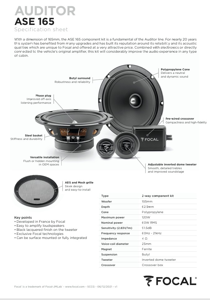 The 2-way component kit ASE 165 delivers neutral and dynamic sound, precise treble and an improved soundstage thanks to its 6 1/2” (16.5cm) woofer with Polypropylene cone and adjustable, mylar inverted dome tweeter.