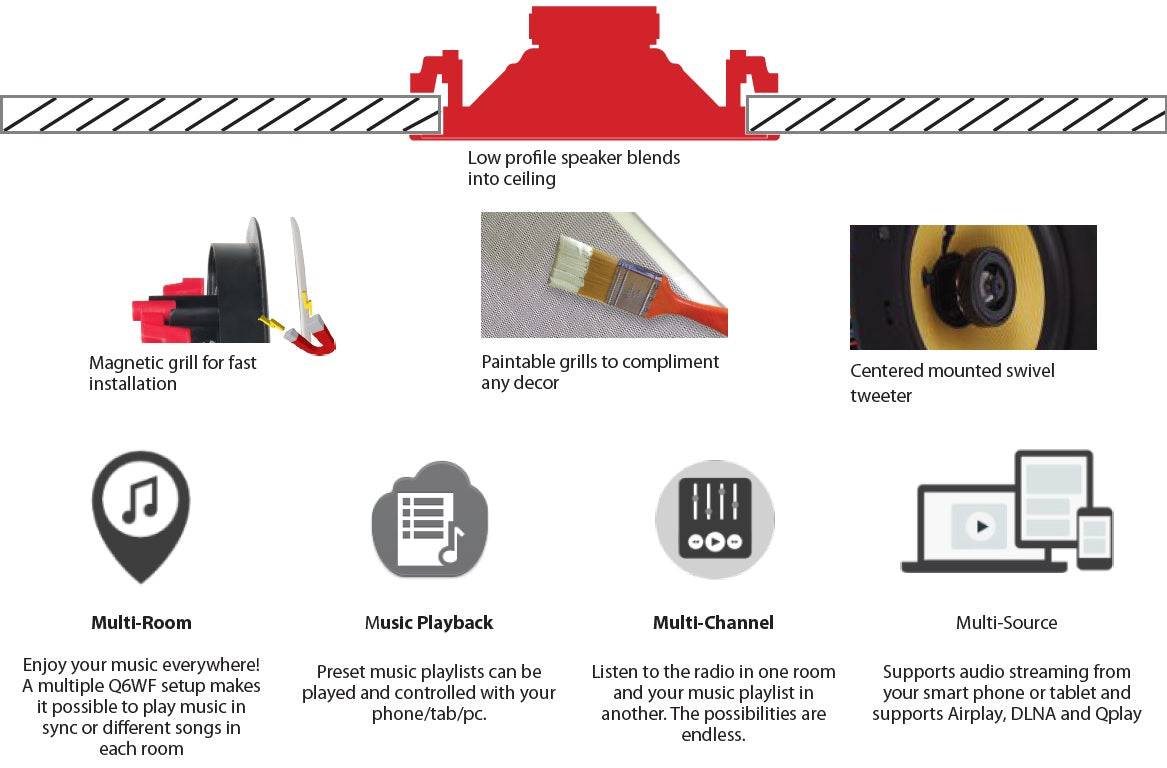 - Wireless, low profile, in-ceiling speaker kit