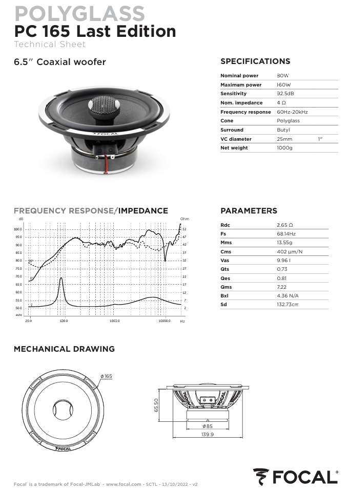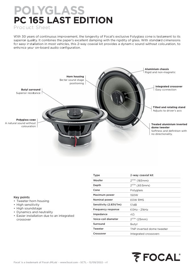 Upgrade your vehicles sound system thanks to the PC 165, a coaxial speaker driver kit with 61/2″ (16.5cm) woofers. The tweeters can be orientated for greater listening comfort, the woofer with its Polyglass cone will surround you in warm sound without coloration.