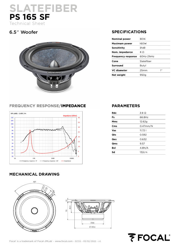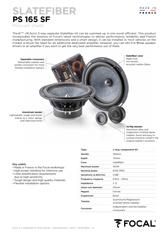 The 2-way component kit PS 165 SF incorporates the essence of Focal's latest technologies to deliver performance, reliability and French manufacturing. Its exclusive Slatefiber cone helps create a rich soundscape. Its standard dimensions of 61/2” (165mm) and smart design means it can be installed in most vehicles on the market. Last but not least, its high sensitivity offers smooth amplification: PS 165 SF can be directly connected to the original car radio or be used with an amplifier to make the most of its performance.