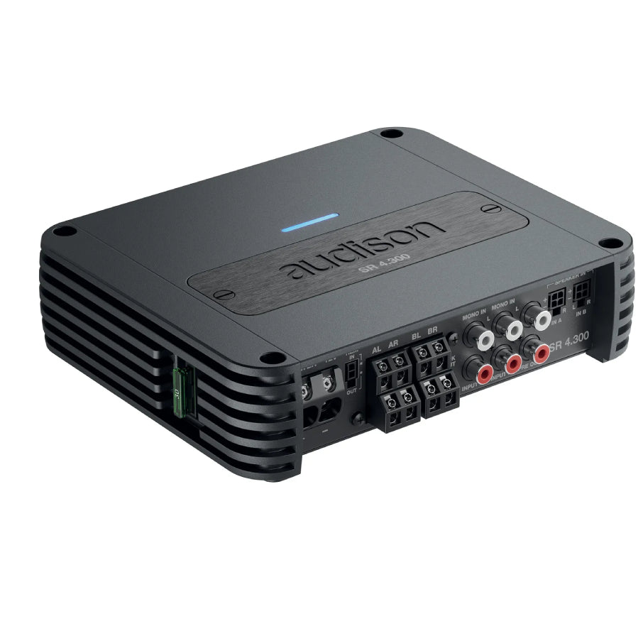 Audison SR 4.300 4-channel amplifier with crossover and great power packed into ultra-compact dimensions (85 W x 4 4Ω)SR line, perfected by taking full advantage of the capabilities of the latest amplification devices. After numerous listening tests with professionals and enthusiasts, Audison's R&D team decided to adopt a new class D technology called ADT (Audison D-Class Technology) for this line of amplifiers, which has made it possible to considerably reduce their size, totally preserving the audio performance that characterizes every Audison design. As far as the electronic design is concerned, every aesthetic and functional detail of the Audison SR 4.300 has been taken care of, resulting in a compact amplifier made of extruded aluminum with rounded corners, which facilitates the installation of the product in narrow spaces. Thanks to the generous heat sinks on the two short sides of the amplifiers, there is no need for internal cooling fans, which often cause noise and dust accumulation. In keeping with tradition, the SR amplifiers confirm their vocation for versatility by including on all models a complete filter section, suitable for any kind of audio system configuration. The controls, protected by a satin-finished aluminum panel, are located on the top panel of the amplifier, so that they can be easily reached from above, even after the product has been installed. When the system includes an Audison bit processor, the filter section can be totally excluded.