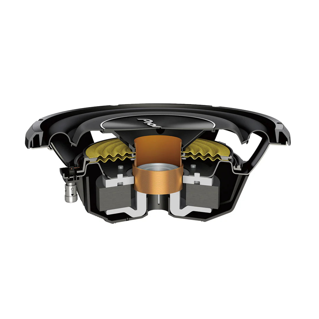 Pioneer's aramid fiber spider design effectively supports the voice coil by damping cone vibrations and improving linearity during sound reproduction. Its soft part ensures smooth movement and clear sound even under high power, while its firmer part controls excessive vibrations and prevents unwanted movements that cause distortion.